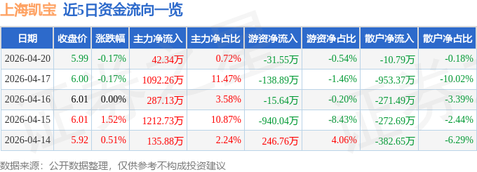 证券之星消息,截至2026年4月20日收盘,上海凯宝(300039)报收于5.99元,下跌0.17%,换手率1.07%,成交量9.82万手,成交额5874.91万元。