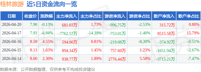 证券之星消息,截至2026年4月20日收盘,桂林旅游(000978)报收于7.9元,下跌0.13%,换手率10.92%,成交量51.11万手,成交额3.95亿元。