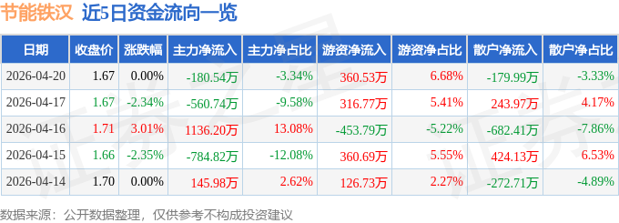 证券之星消息,截至2026年4月20日收盘,节能铁汉(300197)报收于1.67元,上涨0.0%,换手率1.09%,成交量32.29万手,成交额5400.65万元。