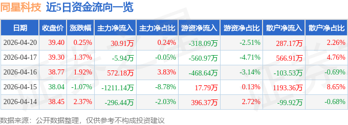 证券之星消息,截至2026年4月20日收盘,同星科技(301252)报收于39.4元,上涨0.25%,换手率6.76%,成交量3.2万手,成交额1.27亿元。