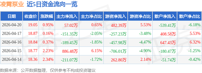 证券之星消息,截至2026年4月20日收盘,凌霄泵业(002884)报收于19.05元,上涨0.95%,换手率1.68%,成交量4.58万手,成交额8721.58万元。