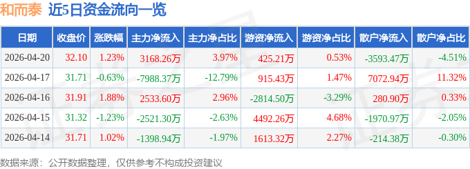 证券之星消息,截至2026年4月20日收盘,和而泰(002402)报收于32.1元,上涨1.23%,换手率3.05%,成交量24.83万手,成交额7.98亿元。