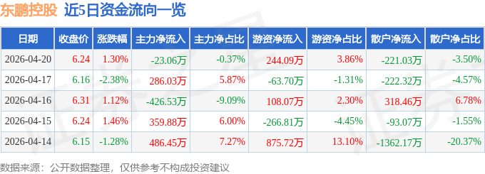 证券之星消息,截至2026年4月20日收盘,东鹏控股(003012)报收于6.24元,上涨1.3%,换手率0.89%,成交量10.14万手,成交额6316.75万元。