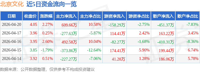 证券之星消息,截至2026年4月20日收盘,北京文化(000802)报收于4.05元,上涨2.27%,换手率1.99%,成交量14.27万手,成交额5764.95万元。
