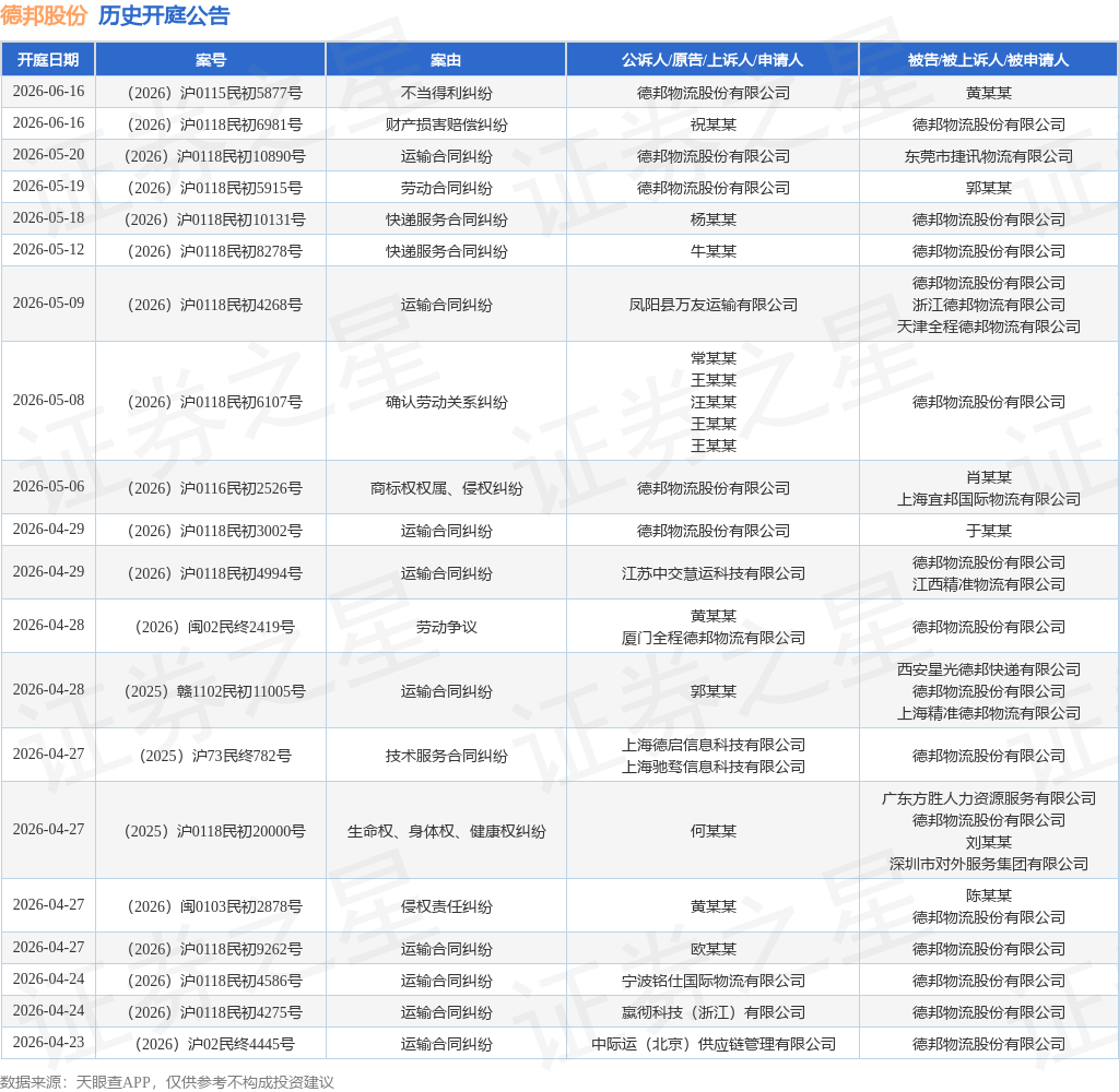 案号:(2026)沪02民终4445号根据统计,近一年内以德邦物流股份有限公司为当事人的历史开庭公告有340则,其中案由为“快递服务合同纠纷”的公告以89则居首,其次为“运输合同纠纷”有78则,“侵害商标权纠纷”有18则。历史开庭公告(前20条)如下: