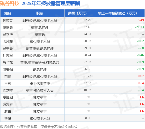 证券之星消息,磁谷科技发布2025年年报,数据显示:公司主营收入3.68亿元,同比减23.05%。归母净利润为995.24万元,同比减80.68%。扣非净利润为624.13万元,同比减85.66%。当年公司员工总数418人,同比增6.09%。人均薪酬18.44万元(注:"人均薪酬"根据定期报告中"应付职工薪酬"附注的本期增加值 / 员工总数计算而来),同比增0.28%。人均创收88.09万元,同比减27.47%。人均创利2.26万元,同比减82.62%。其中管理层薪酬总额为684.21万元,同比上一年减3.76%,薪酬最高的为副总经理,核心技术人员林英哲,薪酬92.29万元。