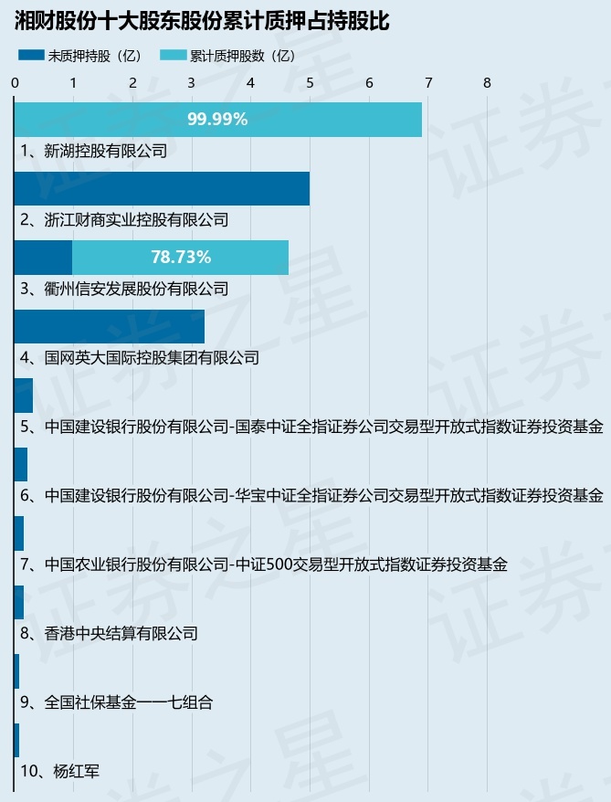 截止本公告日,股东新湖控股有限公司已累计质押股份6.9亿股,占其持股总数的99.99%,股东衢州信安发展股份有限公司已累计质押股份3.66亿股,占其持股总数的78.73%。本次质押后湘财股份十大股东的累计质押股份占持股比例(占持股比例的计算以公司最新一期财务报表公布的十大股东的持股总数为基准)见下图: