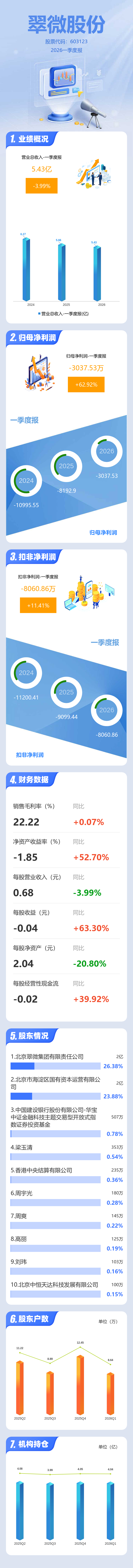 证券之星消息,翠微股份2026年一季报显示,一季度公司主营收入5.43亿元,同比下降4.0%;归母净利润-3037.53万元,同比上升62.92%;扣非净利润-8060.86万元,同比上升11.41%;负债率73.47%,投资收益209.85万元,财务费用1883.21万元,毛利率22.22%。