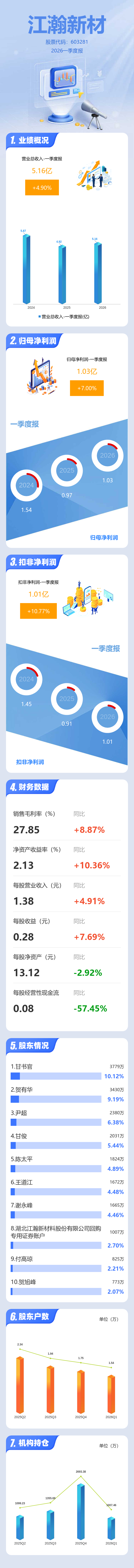 证券之星消息,江瀚新材2026年一季报显示,一季度公司主营收入5.16亿元,同比上升4.91%;归母净利润1.03亿元,同比上升7.01%;扣非净利润1.01亿元,同比上升10.78%;负债率7.54%,投资收益120.93万元,财务费用-1188.62万元,毛利率27.85%。