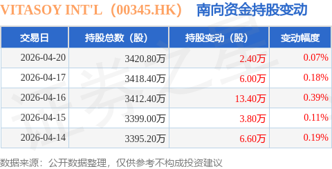 证券之星消息,4月20日南向资金增持2.4万股VITASOY INT'L(00345.HK)。近5个交易日中,获南向资金增持的有5天,累计净增持32.2万股。近20个交易日中,获南向资金减持的有8天,累计净减持60.8万股。截至目前,南向资金持有VITASOY INT'L(00345.HK)3420.8万股,占公司已发行普通股的3.35%。