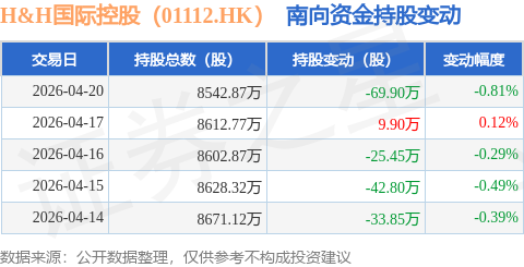 证券之星消息,4月20日南向资金减持69.9万股H&H国际控股(01112.HK)。近5个交易日中,获南向资金减持的有4天,累计净减持162.1万股。近20个交易日中,获南向资金减持的有16天,累计净减持1006.65万股。截至目前,南向资金持有H&H国际控股(01112.HK)8542.87万股,占公司已发行普通股的13.22%。