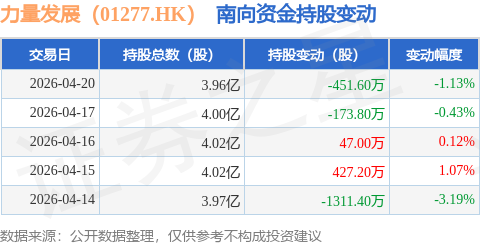 证券之星消息,4月20日南向资金减持451.6万股力量发展(01277.HK)。近5个交易日中,获南向资金减持的有3天,累计净减持1462.6万股。近20个交易日中,获南向资金减持的有11天,累计净减持1826.95万股。截至目前,南向资金持有力量发展(01277.HK)3.96亿股,占公司已发行普通股的4.69%。