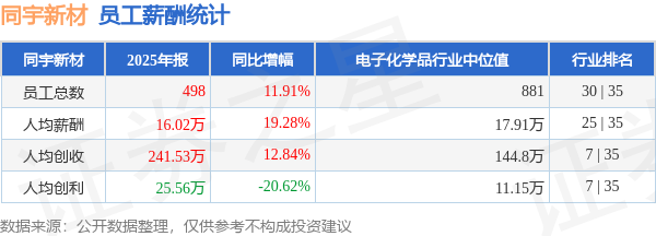 证券之星消息,4月21日同宇新材公布2025年年报,当年营收12.03亿元,同比增26.28%;净利润为1.27亿元,同比减11.16%。根据财报数据披露,当年公司员工总数498人,同比增11.91%;人均薪酬16.02万元,同比增19.28%;人均创收241.53万元,同比增12.84%;人均创利25.56万元,同比减20.62%;公司员工薪酬统计见下表: