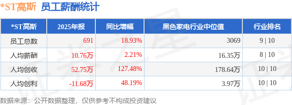 证券之星消息,4月21日*ST高斯公布2025年年报,当年营收3.65亿元,同比增170.55%;净利润为-7960.43万元,同比增39.19%。根据财报数据披露,当年公司员工总数691人,同比增18.93%;人均薪酬10.76万元,同比增2.21%;人均创收52.75万元,同比增127.48%;公司员工薪酬统计见下表: