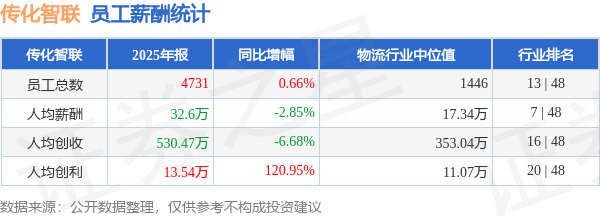 证券之星消息,4月21日传化智联公布2025年年报,当年营收250.97亿元,同比减6.07%;净利润为5.9亿元,同比增282.12%。根据财报数据披露,当年公司员工总数4731人,同比增0.66%;人均薪酬32.6万元,同比减2.85%;人均创收530.47万元,同比减6.68%;人均创利13.54万元,同比增120.95%;公司员工薪酬统计见下表: