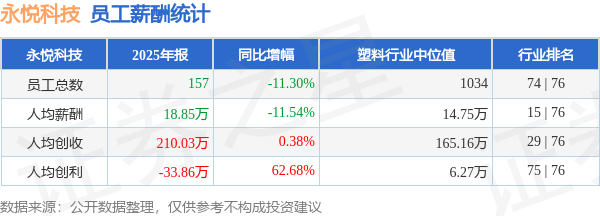 证券之星消息,4月21日永悦科技公布2025年年报,当年营收3.3亿元,同比减10.96%;净利润为-5314.8万元,同比增66.91%。根据财报数据披露,当年公司员工总数157人,同比减11.3%;人均薪酬18.85万元,同比减11.54%;人均创收210.03万元,同比增0.38%;公司员工薪酬统计见下表: