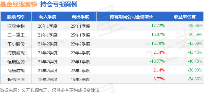 蔡铮管理的交银创业板50指数A基金在20年1季度买入沃森生物,在持有5年又0个季度后在25年1季度卖出。持有期间的估算收益率为-59.86%,持有期间沃森生物在2020年到2025年的年报营业总收入降幅为17.72%。