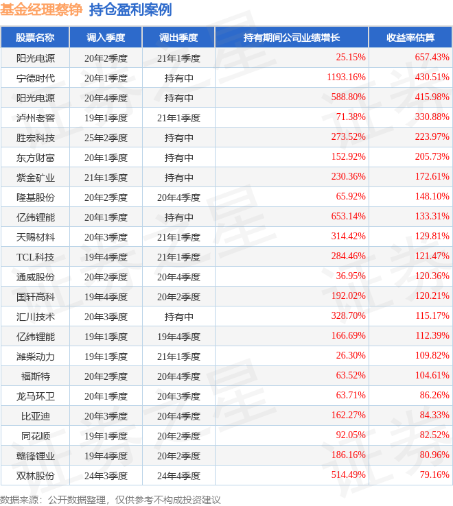 蔡铮管理的交银国证新能源指数(LOF)A基金在20年2季度买入阳光电源,在持有3个季度后在21年1季度卖出。持有期间的估算收益率为657.43%,持有期间阳光电源在2020年到2021年的年报营业总收入增幅达25.15%。