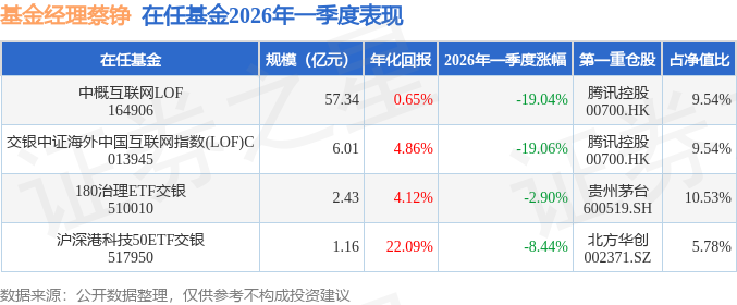 证券之星消息,截止2026年一季度末,基金经理蔡铮旗下共管理4只基金,本季度表现最佳的为180治理ETF交银(510010),季度净值跌2.9%。