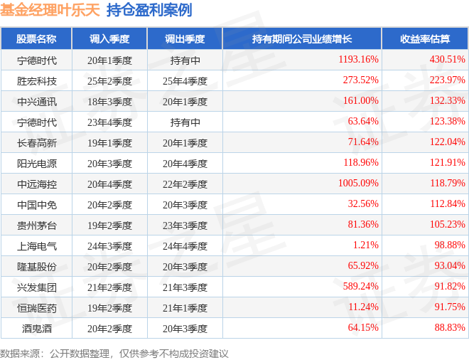 叶乐天管理的建信精工制造指数增强基金在20年1季度买入宁德时代,已连续持有6年又0个季度。持有期间的估算收益率为430.51%,持有期间宁德时代在2020年到2025年的年报归属净利润增幅达1193.16%。
