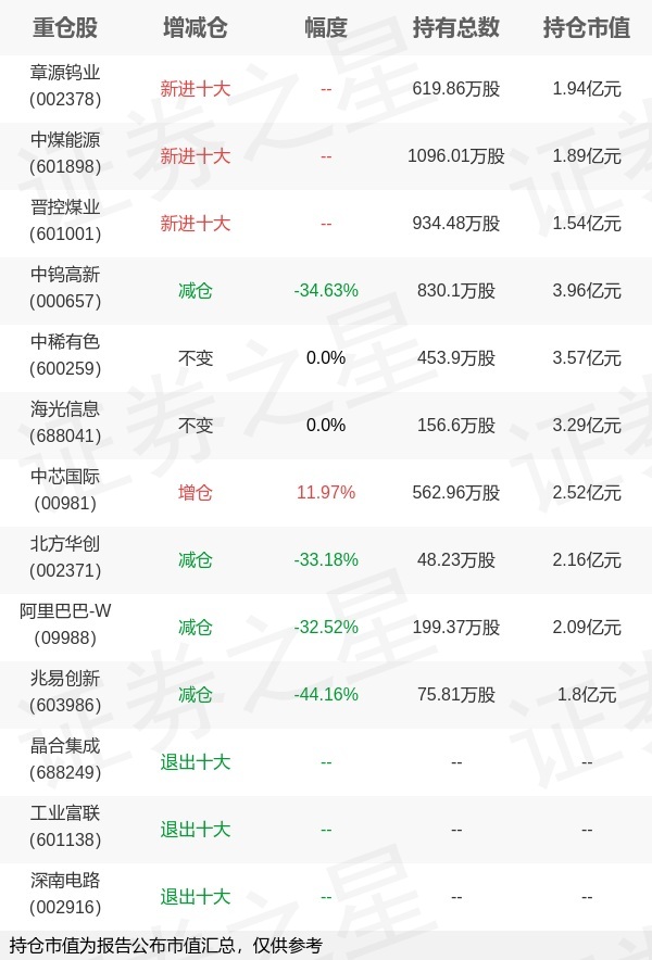 证券之星消息,4月21日银华基金旗下李晓星 张腾 杜宇管理的银华心佳两年持有期混合型基金公布一季报,近1年净值增长率84.86%。与上一季度相比,该基金前十大重仓股新增章源钨业,中煤能源,晋控煤业;其中中钨高新持仓占比8.72%,为该基金第一大重仓股;晶合集成,工业富联,深南电路等退出前十大重仓股;详细数据如下: