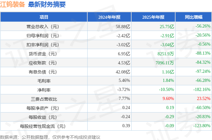 据证券之星公开数据整理,近期江钨装备(600397)发布2025年年报。根据财报显示,江钨装备净利润同比下降20.56%。截至本报告期末,公司营业总收入25.75亿元,同比下降56.26%,归母净利润-2.91亿元,同比下降20.56%。按单季度数据看,第四季度营业总收入1.23亿元,同比下降92.83%,第四季度归母净利润1541.49万元,同比上升119.37%。