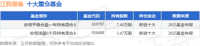 持有江钨装备最多的基金为安信平稳合盈一年持有混合A,目前规模为1.11亿元,最新净值1.1363(4月20日),较上一交易日上涨0.2%,近一年上涨5.23%。该基金现任基金经理为张竞 黄晓宾。