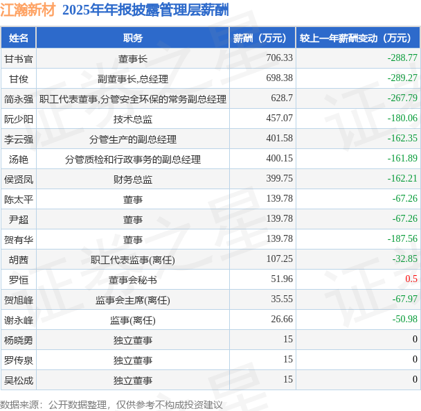 证券之星消息,江瀚新材发布2025年年报,数据显示:公司主营收入18.58亿元,同比减16.14%。归母净利润为4.18亿元,同比减30.54%。扣非净利润为3.93亿元,同比减30.77%。当年公司员工总数987人,同比减0.7%。人均薪酬14.75万元(注:"人均薪酬"根据定期报告中"应付职工薪酬"附注的本期增加值 / 员工总数计算而来),同比减18.64%。人均创收188.29万元,同比减15.55%。人均创利42.38万元,同比减30.04%。其中管理层薪酬总额为4377.72万元,同比上一年减32.48%,薪酬最高的为董事长甘书官,薪酬706.33万元。
