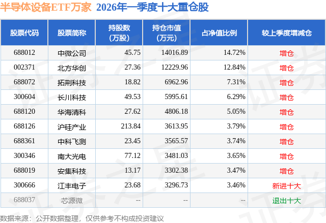 半导体设备ETF万家基金成立于2024年7月24日,基金经理为吴宜蓉,基金跟踪标的为中证半导体材料设备主题指数,成立以来超额回报为-5.59%,近一个月超额回报为0.04%。最新披露的基金持仓数据显示,截止2026年3月31日,该基金第一大重仓股为中微公司(688012),持股占比为14.72%。