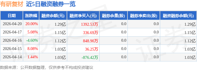 证券之星消息,截至2026年4月20日收盘,有研复材(688811)报收于23.82元,上涨20.0%,涨停,换手率52.8%,成交量48.64万手,成交额11.12亿元。