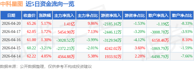 证券之星消息,截至2026年4月20日收盘,中科星图(688568)报收于65.26元,上涨5.17%,换手率2.75%,成交量22.26万手,成交额14.32亿元。