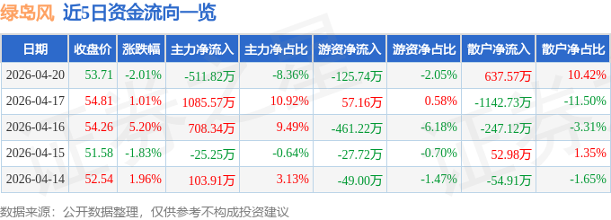 证券之星消息,截至2026年4月20日收盘,绿岛风(301043)报收于53.71元,下跌2.01%,换手率2.01%,成交量1.14万手,成交额6120.15万元。