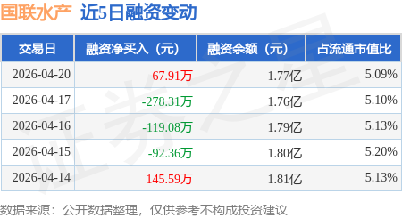 证券之星消息,4月20日,国联水产(300094)融资买入545.09万元,融资偿还477.18万元,融资净买入67.91万元,融资余额1.77亿元。