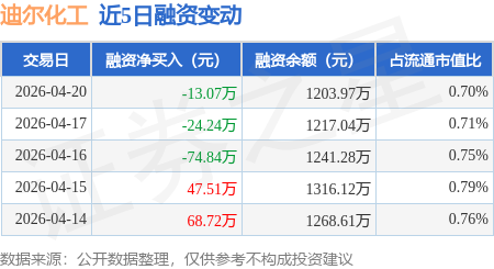 证券之星消息,4月20日,迪尔化工(920304)融资买入137.16万元,融资偿还150.23万元,融资净卖出13.07万元,融资余额1203.97万元。