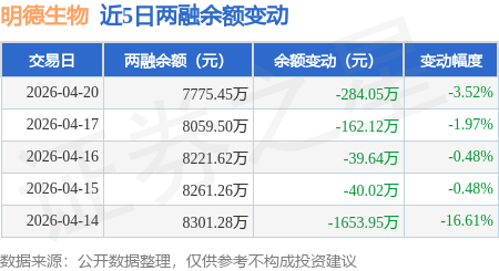 证券之星消息,4月20日,明德生物(002932)融资买入798.95万元,融资偿还1084.04万元,融资净卖出285.08万元,融资余额7746.22万元。