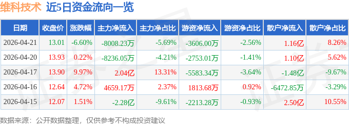 证券之星消息,截至2026年4月21日收盘,维科技术(600152)报收于13.01元,下跌6.6%,换手率20.35%,成交量107.65万手,成交额14.06亿元。