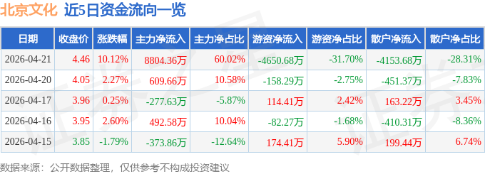 证券之星消息,北京文化4月21日涨停收盘,收盘价4.46元。该股于9点30分涨停,未打开涨停,截止收盘封单资金为1.29亿元,占其流通市值4.06%。