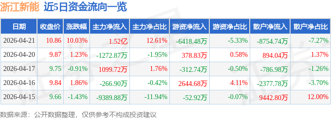 证券之星消息,浙江新能4月21日涨停收盘,收盘价10.86元。该股于11点25分涨停,未打开涨停,截止收盘封单资金为1.38亿元,占其流通市值0.53%。
