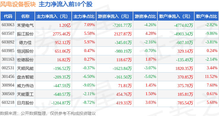 从资金流向上来看,当日风电设备板块主力资金净流出12.28亿元,游资资金净流入1490.69万元,散户资金净流入12.13亿元。风电设备板块个股资金流向见下表: