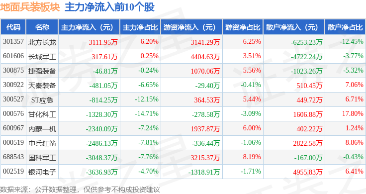 从资金流向上来看,当日地面兵装板块主力资金净流出2.34亿元,游资资金净流入1.07亿元,散户资金净流入1.27亿元。地面兵装板块个股资金流向见下表: