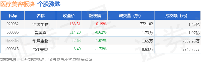 证券之星消息,4月21日医疗美容板块较上一交易日下跌0.89%,*ST美谷领跌。当日上证指数报收于4085.08,上涨0.07%。深证成指报收于14982.14,上涨0.1%。医疗美容板块个股涨跌见下表:
