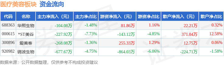 从资金流向上来看,当日医疗美容板块主力资金净流出600.08万元,游资资金净流入194.08万元,散户资金净流入406.0万元。医疗美容板块个股资金流向见下表: