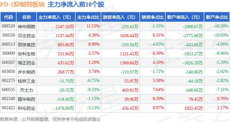 从资金流向上来看,当日PD-1抑制剂板块主力资金净流出9.16亿元,游资资金净流入2.55亿元,散户资金净流入6.61亿元。PD-1抑制剂板块个股资金流向见下表: