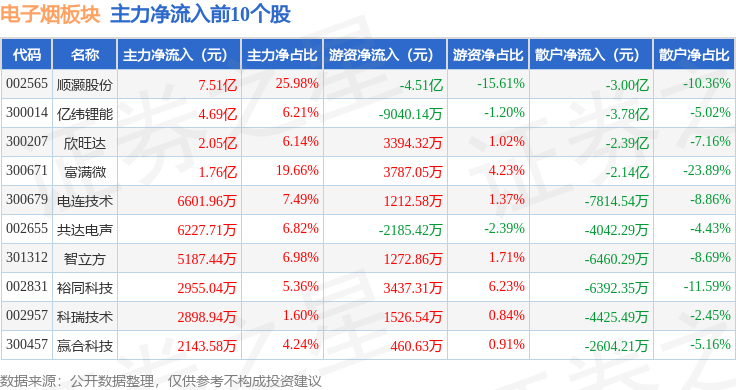 从资金流向上来看,当日电子烟板块主力资金净流出3.87亿元,游资资金净流入2.81亿元,散户资金净流入1.06亿元。电子烟板块个股资金流向见下表: