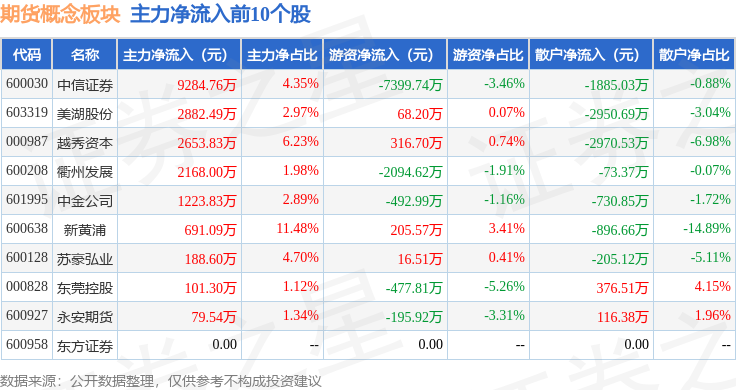 从资金流向上来看,当日期货概念板块主力资金净流出18.72亿元,游资资金净流入3.64亿元,散户资金净流入15.08亿元。期货概念板块个股资金流向见下表: