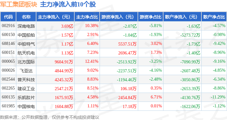从资金流向上来看,当日军工集团板块主力资金净流出53.07亿元,游资资金净流入6.91亿元,散户资金净流入46.16亿元。军工集团板块个股资金流向见下表:
