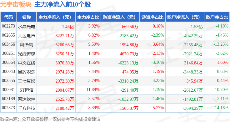 从资金流向上来看,当日元宇宙板块主力资金净流出58.3亿元,游资资金净流入6.84亿元,散户资金净流入51.46亿元。元宇宙板块个股资金流向见下表: