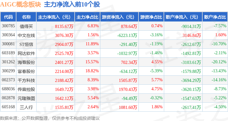 从资金流向上来看,当日AIGC概念板块主力资金净流出68.89亿元,游资资金净流入13.84亿元,散户资金净流入55.05亿元。AIGC概念板块个股资金流向见下表: