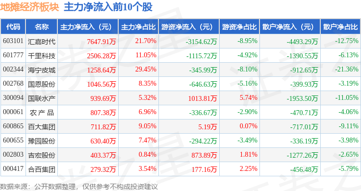 从资金流向上来看,当日地摊经济板块主力资金净流出1.99亿元,游资资金净流出7325.94万元,散户资金净流入2.72亿元。地摊经济板块个股资金流向见下表: