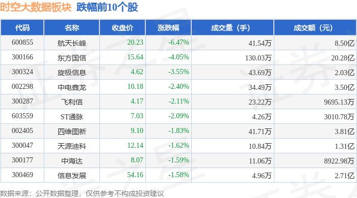证券之星消息,4月21日时空大数据板块较上一交易日下跌0.99%,航天长峰领跌。当日上证指数报收于4085.08,上涨0.07%。深证成指报收于14982.14,上涨0.1%。时空大数据板块个股涨跌见下表:
